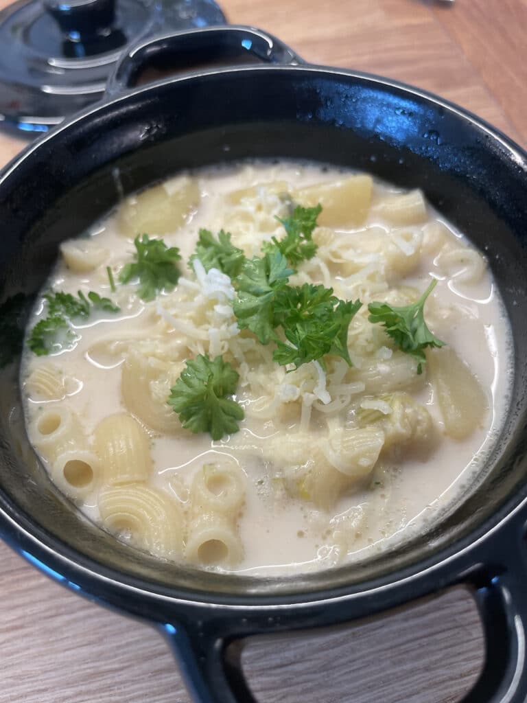 Wenn die Nudeln fertig sind kannst Du den Herd abstellen und die Suppe noch mit der Sahne aufgießen. Auch hier kannst Du natürlich nach belieben ein wenig mehr nehmen und unterrühren. Idealerweise sollte die Soup de Chalet nicht mehr kochen.